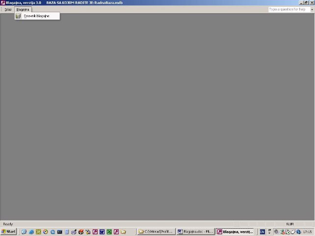 Na sl. 1 prikazan je glavni meni programa blagajna. Kroz glavni meni vrši se izbor akcija za rad sa programom.