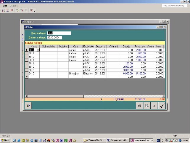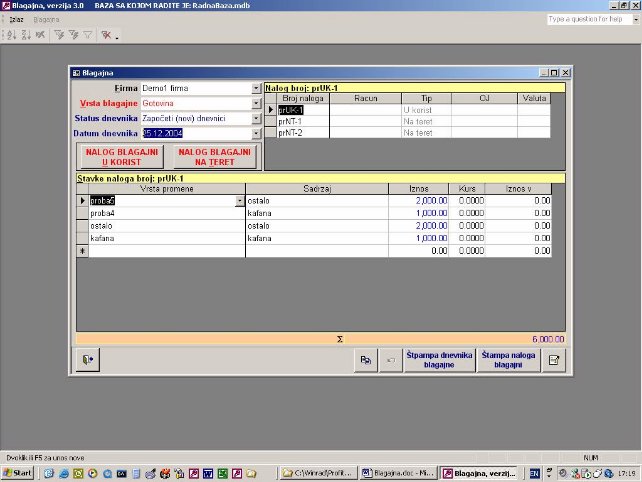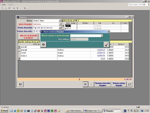 Za broj naloga nudi se zadnji korišteni broj, a datum naloga je datum dnevnika blagajne. Stavke naloga se unose i koriguju na način kao što je objašnjeno u programu nalog.