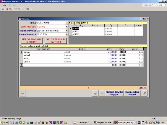 Za svaki otvoreni nalog blagajni potrebno je uneti stavke. Ovde se srećemo sa automatskim generisanjem naloga, što će kasnije biti objašnjeno. Stavke se unose za nalog blagajni na koji je pozicioniran pokazivač u spisku naloga za izabrani dnevnik. Promenom pokazivača na novi nalog blagajni automatski se prikazuju pripadajuće stavke za njega.