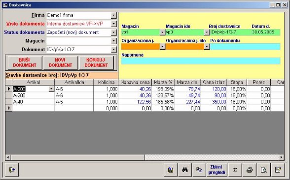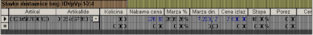 - Artikal –bira se izborom iz kombinovane liste, koja je ograničena na artikle iz šifarnika za uneti magacin u zaglavlju dostavnice. Unosom artikla počinje se unos svake stavke. Nakon izbora artikla program za obeležja «Količina» i «Nanavna cena» i «Cena izlaz» nudi podatke sa lagera, ukoliko oni postoje.