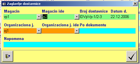 - Magacin - Izbor se vrši iz kombinovane liste «Magacin». Podatak je obavezan i opredeljuje iz koga magacina izlazi roba, koji se lager i kartica ažuriraju i koji se šifarnik artikala koristi pri unosu stavki. Kombinovana lista «Magacin» je ograničena vrstom dostavnice koja se otpočinje, pa će za izlaz iz veleprodaje biti prikazani samo veleprodajni magacini, za maloprodaju samo maloprodajni magacini itd. Kombinovana lista magacin ne omogućava unos i ažuriranje šifarnika.