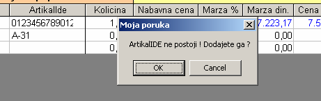 - Artikali de –bira se izborom iz kombinovane liste, koja je ograničena na artikle iz šifarnika za uneti magacin ide u zaglavlju dostavnice. Unosom «artikla ide» nastavlja se unos svake stavke. Nakon izbora «artikla ide» program za obeležja «Cena ulaz» nudi podatke sa lagera, ukoliko oni postoje. Pri prelasku na «artikal ide» program sam pronalazi i nudi isti IDLokalni kao artikal. Ukoliko «artikal ide» za taj IDLokalni ne postoji u šifarniku program pita da ga doda kao na slici:
