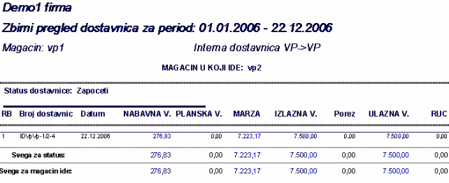 - omogućava izradu zbirnih izveštaja po dostavnica za uneti period. Izveštaj sadrži zbirno nabitnije elemente za svaku dostavnicu.