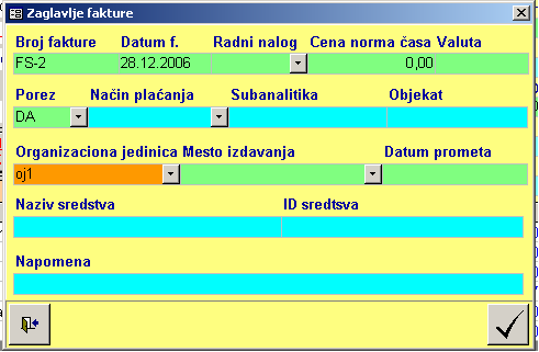 Zaglavlje fakture unosi se i koriguje preko posebne forme za zaglavlje. Unosom zaglavlja faktura dobija status započeta i potrebno je potom uneti stavke. Zaglavlje je uvek isto bez obzira na vrstu izabranog dokumenta, a sadrži podatke koji su obavezni i koji nisu. Program vrši kontrolu unosa podataka tako da ne može doći do greške.