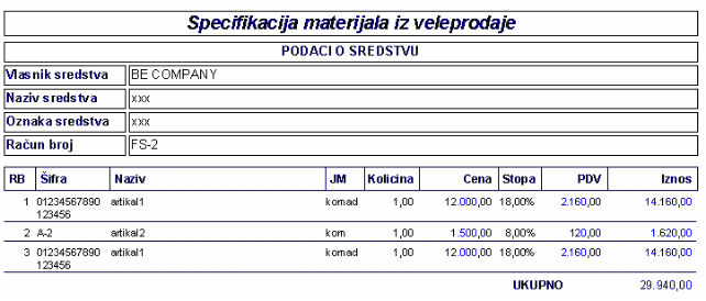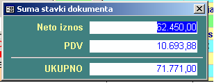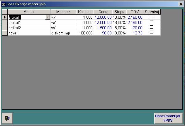 - vraća na prethodnu formu i upisuje stvku za materijal kao stavku fakturte. Ukoliko je trebovano iz veleprodaje i maloprodaje onda se dodaju dva stava. Takođe se dodaju posebni stavovi za robu sa različitom stopom.