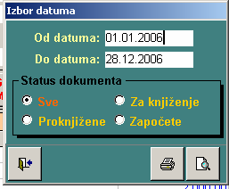 omogućava izradu izveštaja na osnovu urađenih faktura za neki period. Poziva se forma gde se vrši izbor dodatnih podataka: