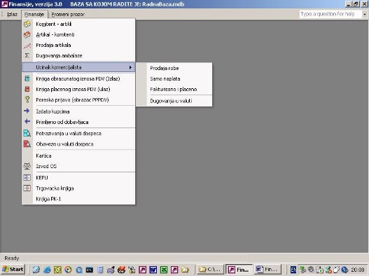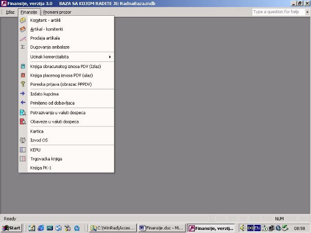 Na sl. 1 prikazan je glavni meni programa finansije. Kroz glavni meni vrši se izbor akcija za rad sa programom.