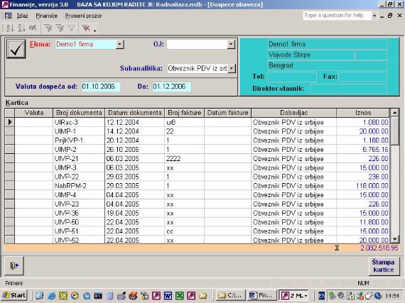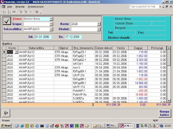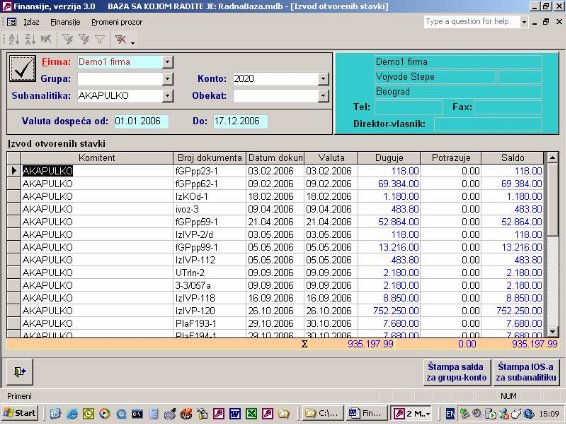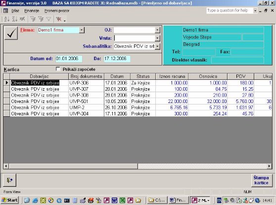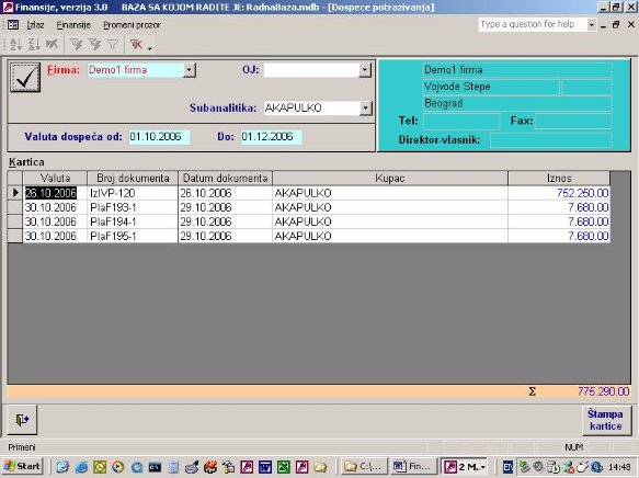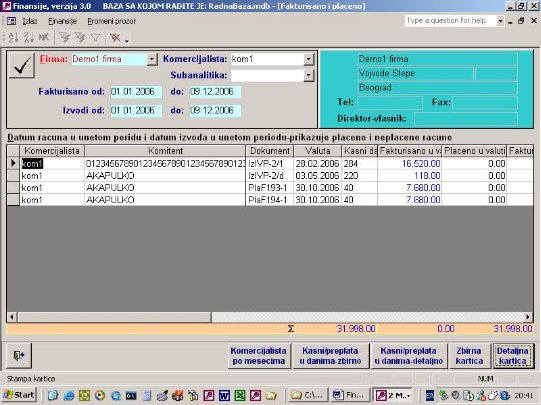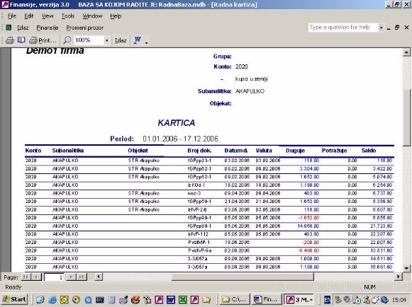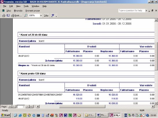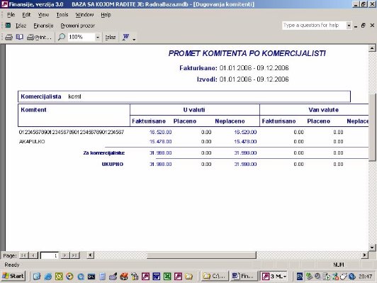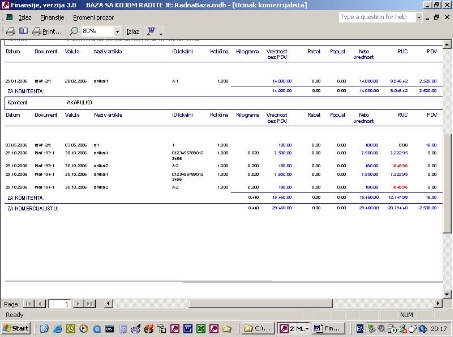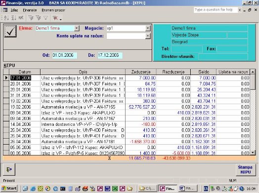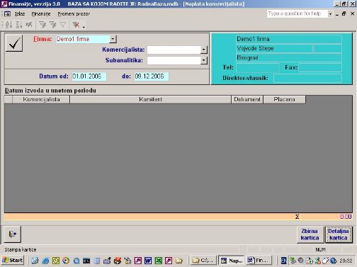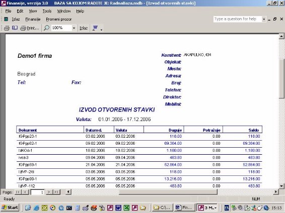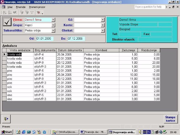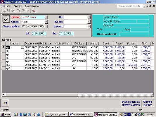 Ukoliko firma vodi samo robno poslovanje na računaru ona nema mogućnost da ima karticu kupca i dobavljača jer nema knjiženja u finansijama. Ovaj izveštaj (sl. 41) omogućava da iz proknjižene dokumentacije i pod uslovom da se unese izvod kroz program nalozi, kao što je objašnjeno, firma ima karticu svojih komitenata. Zaduženje je kroz dokumentaciju a uplata je kroz izvod. Ona će se slagati sa finasijama u trenutku kada su sva dokumenta proknjižena.