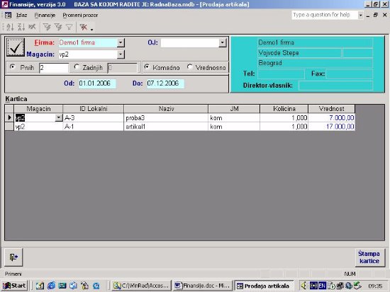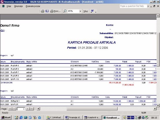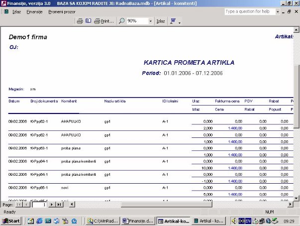 Na osnovu izabranog artikla dobija se izveštaj o njegovom prometu (ulazu i izlazu) po komitentima (sl. 6). Kartica će sadržati sve iznose vezane za ulaz i izlaz artikla. Kartica liči na klasičnu robnu karticu samo što ima puno više detalja iz dokumentacije.