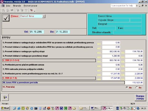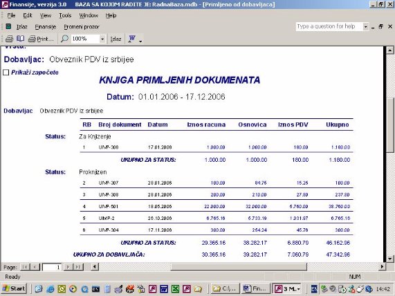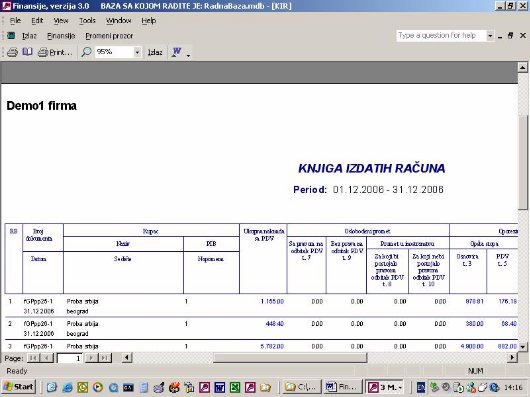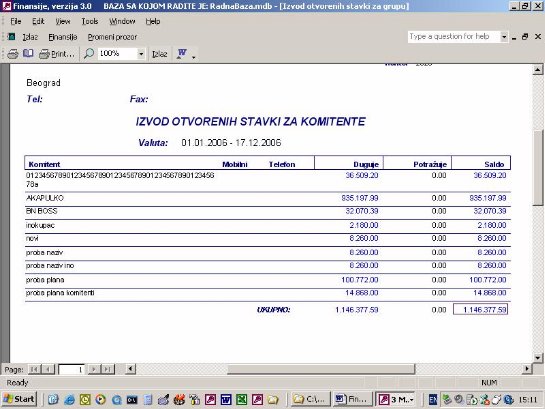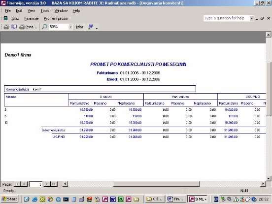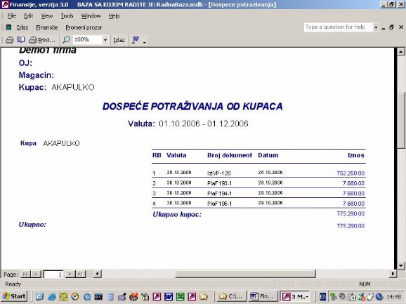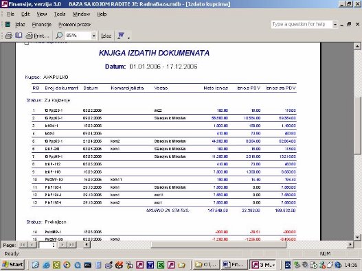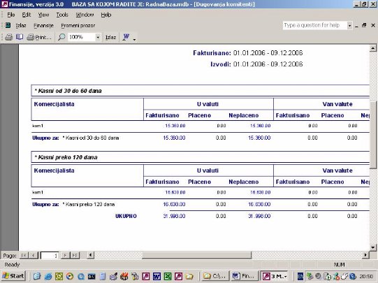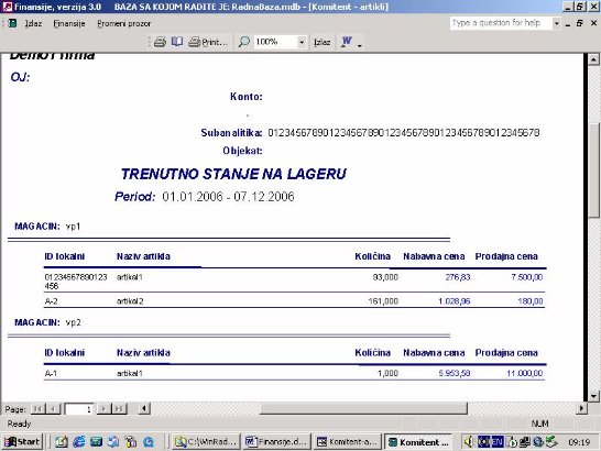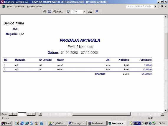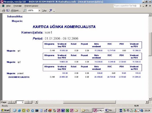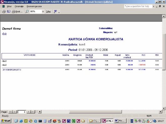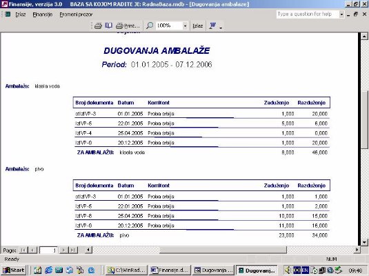 Sve opcije programa služe za izradu finansijskih izveštaja. Podaci za izveštaje se koriste iz urađene dokumentacije. Na sl. 2 dat je primer izveštaja. Forma je uslovno podeljena u tri dela. U jednom se postavlja kriterijum na osnovu koga će biti prikazan izveštaj. U drugom delu prikazani su podaci o firmi sa kojom se radi. U trećem delu su stavke izveštaja.