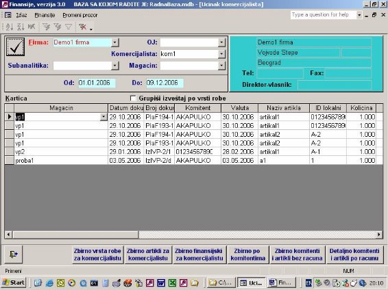 Na osnovu izabranog komitenta dobija se izveštaj koje je artikle sve kupio ili koji su od njega nabavljeni (sl. 3). Kartica će sadržati sve iznose vezane za nabavku, odnosno prodaju artikla izabranom kmitentu.