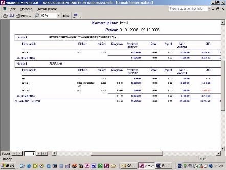 Ovaj izveštaj dobija se direktno iz faktura a odnosi se na promet robe koji je ostvario komercijalista (sl. 13). Iz dobijenih podataka omogućena je štampa raznih izveštaja po sadržaju i grupisanju podataka.
