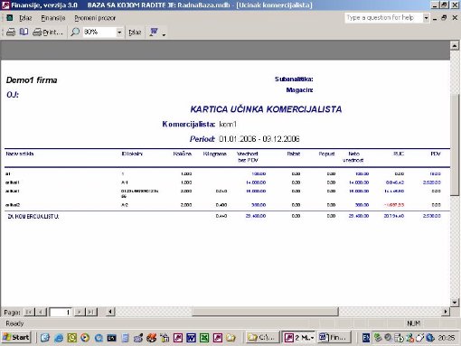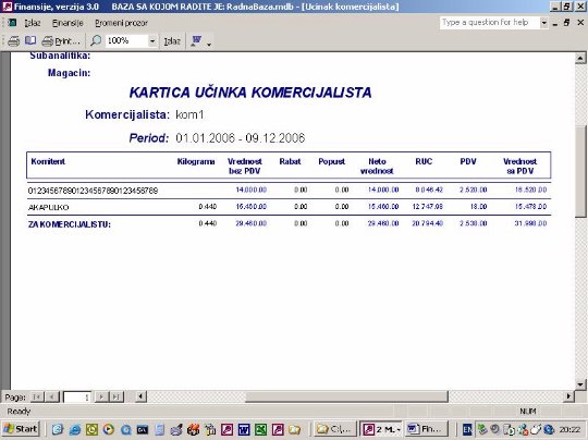 Ovaj izveštaj (sl. 12) omogućava pregled učinka komercijalista na osnovu fakturisanog i plaćenog. Da bi izveštaj bio ispravan uplate se unose preko izvoda i vezuju po broju dokumenta koji je plaćen.