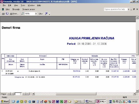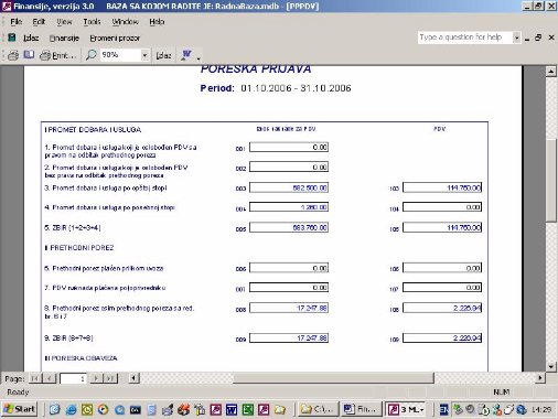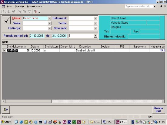 - poreski period – program nudi 01.01. pa do tekućeg datuma. Koriguje se za period koji se želi videti. Datum podrazumeva poreski period koji je unet na dokumentu. U nastavku perioda može se koja su dokumenta u periodu, a koja van perioda.