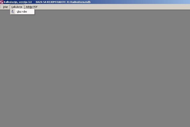 Izborom stavke «Ulaz robe» iz glavnog menija otvoriće se ekranski formular koji služi za unos i ažuriranje kalulacija (sl. 2). Kalkulacije, kao što i sam meni kaže služe za ulaz robe.