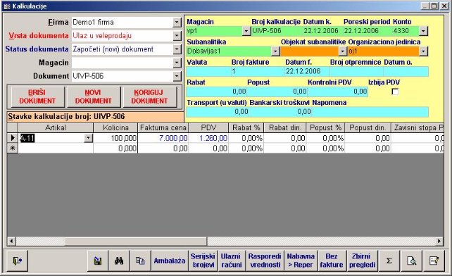 - Artikal –bira se izborom iz kombinovane liste, koja je ograničena na artikle iz šifarnika za uneti magacin u zaglavlju kalkulacije. Unosom artikla počinje se unos svake stavke. Nakon izbora artikla program za obeležja «Količina» i «Cena» nudi podatke sa lagera, ukoliko oni postoje.