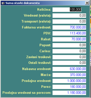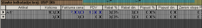 Zbirne vrednosti za fakturu – ukoliko su na fakturi rabat i popust dati u ukupnom iznosu oni se ovde unesu, a pri izradi kalkulacije se ne unose kod svake stavke. Na kraju se rasporede po stavkama (biće objašnjeno).**