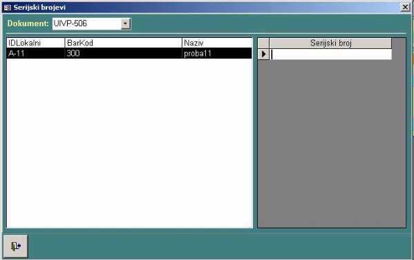 U levom delu formulara nalazi se lista artikala u zadatom magacinu i kalkulaciji koji se vode po serijskim brojevima, a u desnom delu ekrana se nalazi tabela gde treba uneti serijske brojeve za artikal iz liste levo.
