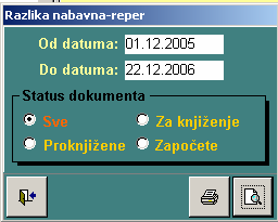 - kod lagera je objašnjeno da se za svaki artikal može uneti reper cena koja služi za upoređivanje sa nabavnom u kalkulaciji. Prilikom unosa svake stavke program će za one artikle koji imaju unetu reper cenu a ona se razlikuje – veća je od nabavne javiti upozorenje. Neće ograničavati dalji rad. Pozivom ovog dugmeta omogućena je izrada izveštaja za sve nabavke gde se razlikuje reper cena od nabavne za uneti period.