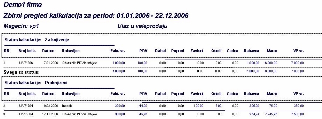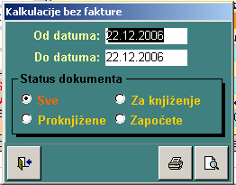 - kalkulacija se može raditi na osnovu fakture ili otpremnice. Ukoliko se radi na osnovu otpremnice, kada se dobije faktura ona se može uneti u zaglavlje kalkulacije bez obzira na njen status. Sve one koje su urađene na osnovu otpremnice a nije dobijena faktura ne mogu ući za obračun PDV-a. Njima se mora promeniti poreski period u zaglavlju kalkulacije na naredni. Ovo dugme omogućava izveštaj za sve kalkulacije koje nemaju fakturu.