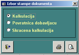omogućava štampu kalkulacije. Poziva se forma za štampu koja omogućava dodatni izbor pri