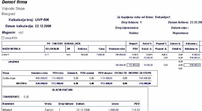 Omogućeno je da se štampa kalkulacija u punom ili skraćenom obliku i povratnica dobavljaču. Povratnica se radi isto kao kalkulacija, ali je kod količina predznak minus. Štampa se na posebno obrascu.