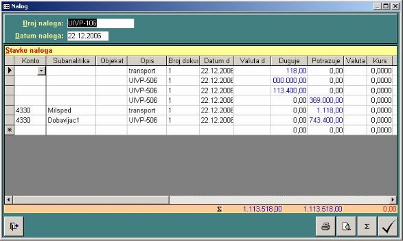 kalkulacije. Tek knjiženjem naloga izborom dugmeta ažuriraju se zalihe i nalog odlazi u glavnu knjigu.
