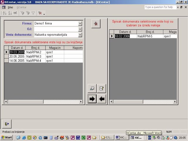 Na sl. 1 prikazan je glavni meni programa KiCentar. Kroz glavni meni poziva se forma za izbor i knjiženje dokumenata.