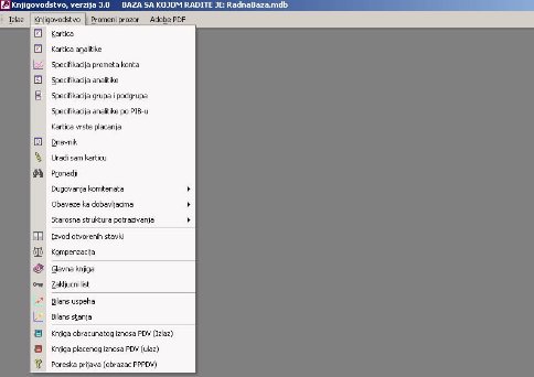 Na sl. 1 prikazan je glavni meni programa knjigovodstvo. Kroz glavni meni vrši se izbor akcija za rad sa programom.