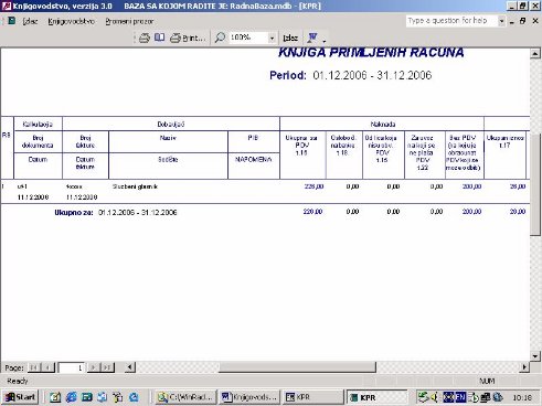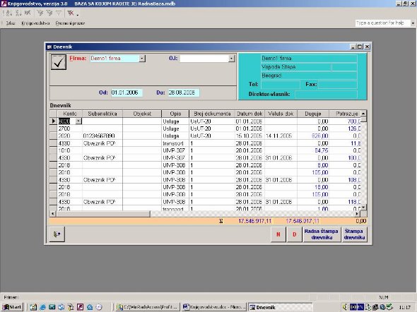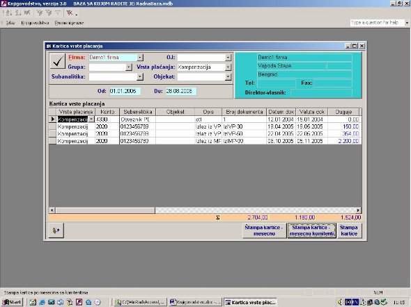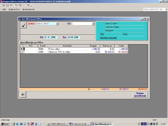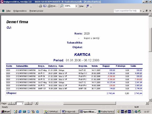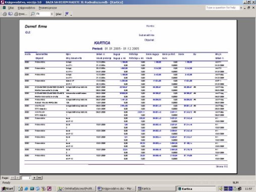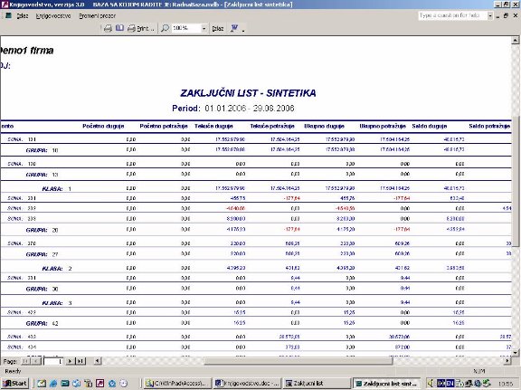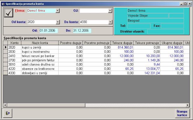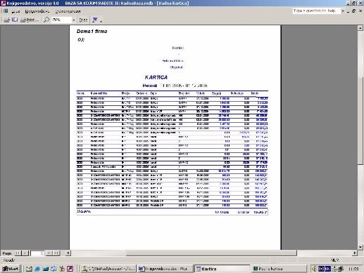 Sve opcije programa služe za izradu knjigovodstvenih izveštaja. Podaci za izveštaje se koriste iz glavne knjige. Na sl. 2 dat je primer izveštaja. Forma je uslovno podeljena u tri dela. U jednom se postavlja kriterijum na osnovu koga će biti prikazan izveštaj. U drugom delu prikazani su podaci o firmi sa kojom se radi. U trećem delu su stavke izveštaja.