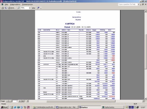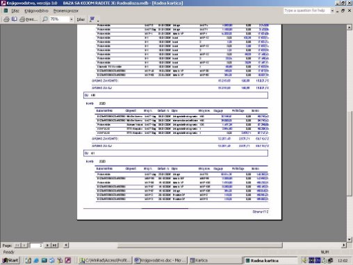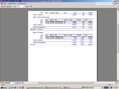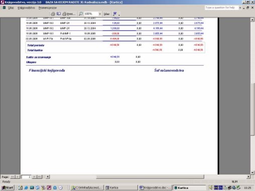 Štampa dobijene finansijske kartice (sl. 10). Kartica se štampa grupisana po broju dokumenta. Sva knjiženja grupisana su po tarifama, tako da se mogu u jednom nalogu naći stavke za obe tarife. Ovaj izveštaj to grupiše po broju dokumenta u okviru naloga.