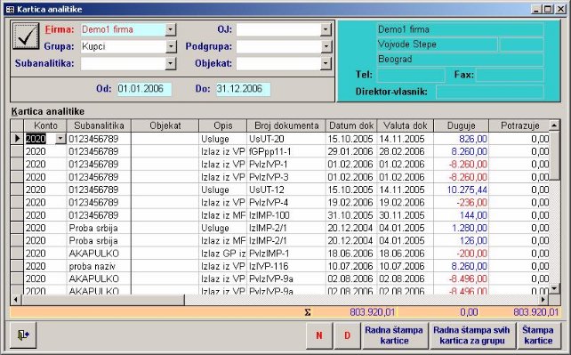 Kartica koja je objašnjena u prethodnoj opciji podatke daje za izabrani konto. Ukoliko jednu grupu subanalitike (npr. Kupci) imamo knjiženu na više konta karticu za tu grupu ne možemo dobiti. Tu mogućnost pruža nam kartica analitike (sl. 13). Ona daje izveštaj pre svega za grupu subanalitike. Kartica će sadržati sve stavke naloga iz glavne knjige koje zadovoljavaju uneti kriterijum.
