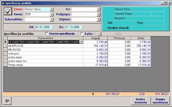 Izveštaj prikazuje specifikaciju za uneti raspon konta (sl. 14). Sadrži početno, tekuće stanje i saldo po kontima.
