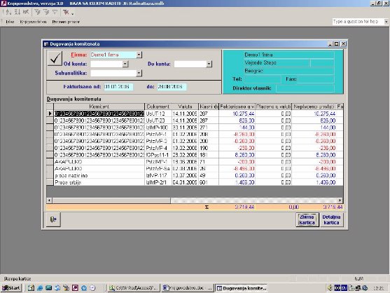 Izveštaj sadrži detaljnu i zbirnu karticu. Na detaljnoj se vide komitenti sa brojevima dokumenata. Na zbirnoj kartici se vide samo komitenti zbirno.