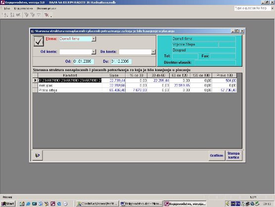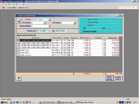 Za uneti period generiše se izveštaj koji obuhvata sva dokumenta čiji datum valute pripada periodu, pa se od selektovanih dokumenata prikazuje štaj je plaćeno od toga i šta je još uvek ne.