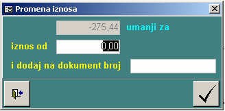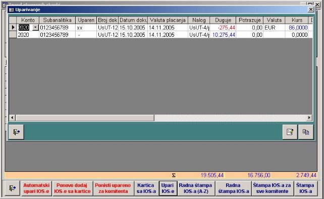- Upari IOS-e – poziva se forma za uparivanje IOS-a (sl. 26). Dostupna jedino ukoliko se uđe sa lozinkom (admin). Uparivanje je moguće na dva načina: promenom broj dokumenta i prebacivanjem iznosa sa jednog broja dokumenta na drugi broj. Uparivanje se vrši za selektovanu stavku na IOS-u. Za nju se dobije tabela sa promenama. Za izabrani slog vrši se promena broja ili prebacivanje iznosa na drugi broj.
