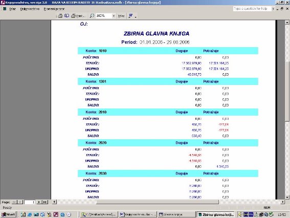 Postoji štampa detaljne i zbirne glavne knjige. Detaljna glavna knjiga prikazuje sve stavke na kojima je knjiženo, dok zbirna samo sume na kontima koja su radila (sl. 30 i 31).