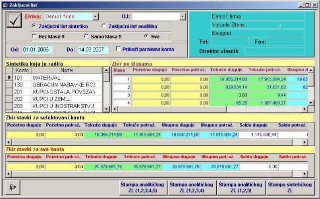 Ukoliko se uključi opcija «prikaži paralelna konta» onda će zaključni list dati na osnovu paralelnih konta unetih u kontnom planu.