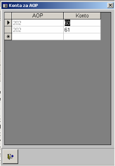 - U programu je unapred definisano koja konta ulaze u koji AOP. Ukoliko se želi nešto dodati ili izmeniti poziva se se forma koja za AOP na kome je pozicionirano u bilansu daje mogućnost unosa i izmene konta koja se sabiraju za njega što je prikazano na narednoj slici.