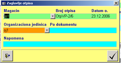 - Magacin - Izbor se vrši iz kombinovane liste «Magacin». Podatak je obavezan i opredeljuje odakle roba izlazi, koji se lager i kartica ažuriraju i koji se šifarnik artikala koristi pri unosu stavki. Kombinovana lista «Magacin» je ograničena vrstom otpisa koji se otpočinje. Kombinovana lista magacin ne omogućava unos i ažuriranje šifarnika. Ukoliko je uneta makar jedna stavka otpisa izabrani magacin se ne može menjati jer su sve stavke vezane za jedan magacin.
