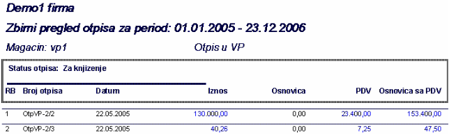 omogućava izradu izveštaja na osnovu urađenih otpisa za neki magacin i period. Poziva se forma gde se vrši izbor magacina, perioda i statusa dokumenata.