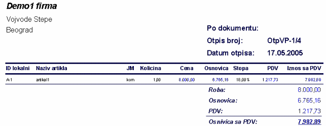 - Artikal –bira se izborom iz kombinovane liste, koja je ograničena na artikle iz šifarnika za uneti magacin u zaglavlju otpisa. Unosom artikla počinje se unos svake stavke. Nakon izbora artikla program za obeležja «Količina» i «Cena» nudi podatke sa lagera, ukoliko oni postoje. Ako artikal nema lager ili nema dovoljno količine na njemu, program će vas obavestiti da ne možete otpisati artikal koji ne postoji na zalihama. Ukoliko je u servisnom modulu podešeno da lager ne može ići u minus program dozvoljava unos otpisa ali se on može samo štampati.