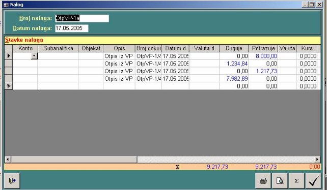 Rad sa nalozima objašnjen je u modulu nalozi. Važno je napomenuti da se nudi zadnji broj naloga za izabranu otpisa. Može se neograničeni broj puta ući u nalog i vratiti se u formu otpisa.