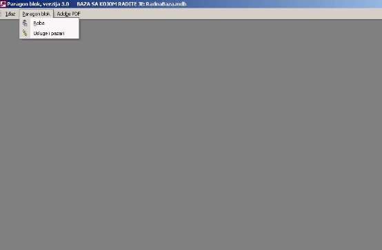 Na sl. 1 prikazan je glavni meni programa paragon blok. Rad sa menijima (menu bar), paletama sa alatkama (toolbar) detaljno je obrađen u uvodnim napomenama za rad sa aplikacijom Profit soft u Windows okruženju. Osnove rada sa programima objašnjene su u modulu trgovina i usluge te će ovde biti objašnjene samo specifičnosti za paragon blok.