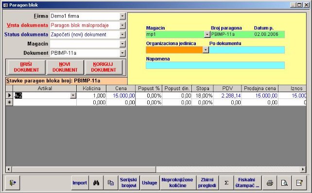 - Datum paragon bloka - nudi se sistemski datum. Moguće je uneti datum po želji, ali treba voditi računa o datumima knjiženja ulaza i izlaza robe zbog uticaja na karticu artikala.