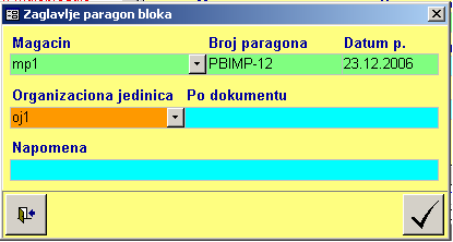 - Magacin - Izbor se vrši iz kombinovane liste «Magacin». Podatak je obavezan i opredeljuje odakle roba izlazi, koji se lager i kartica ažuriraju i koji se šifarnik artikala koristi pri unosu stavki. Kombinovana lista «Magacin» je ograničena vrstom paragon bloka koji se otpočinje. Kombinovana lista magacin ne omogućava unos i ažuriranje šifarnika. Ukoliko je uneta makar jedna stavka paragon bloka izabrani magacin se ne može menjati jer su sve stavke vezane za jedan magacin.