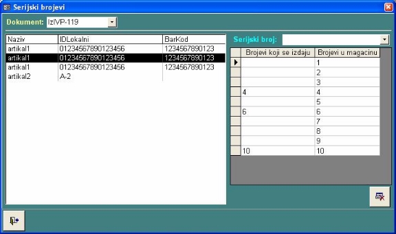 U levom delu formulara nalazi se lista artikala u zadatom magacinu koji se vode po serijskim brojevima, a u desnom delu ekrana se nalazi kombinovana lista i tabela artikala koji se izdaju po serijskim brojevima. Jednom izabrani artikal može se skinuti sa liste za izdavanje