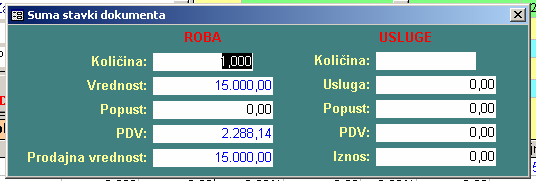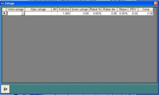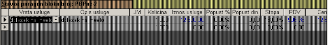 - Pritiskom na komandno dugme prikazaće se ekranski formular za unos usluga koje se rade zajedno sa robom. Izborom ove akcije unosimo još jedan skup stavki, koji je prikazan na sledećom ekranskom formularu: