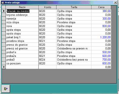 Pri unosi vrste usluge definiše se naziv, konto prihoda na koji se knjiži, tarifa kojoj pripada i cena koja se nudi pri njenom izboru. Važno je napomenuti da se jednom dodeljena tarifa nekoj vrsti usluge ne može menjati zbog poreske evidencije. U slučaju potrebe otvara se nova usluga sa novom tarifom.