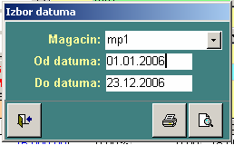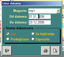 Pritiskom na neko od komandnih dugmadi poziva se forma gde se vrši izbor magacina, perioda i statusa dokumenata.